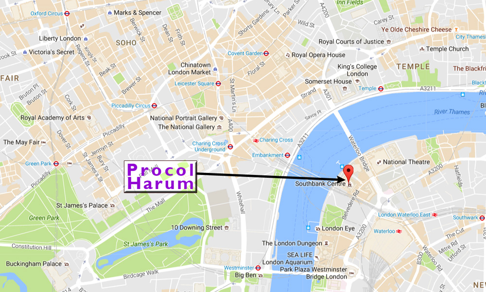 Centre, Belvedere Rd, London SE1 8XX Opened in 1951 as part of the Festival of Britain, the Grade I listed Hall is one of the world’s leading performance venues. The auditorium has a fixed raked seating capacity of 2,500. Procol Harum last played the RFH in November 1973 (setlist here). Public booking information is here Schedule of events is here Ticket enquiries: 0844 875 0073 |