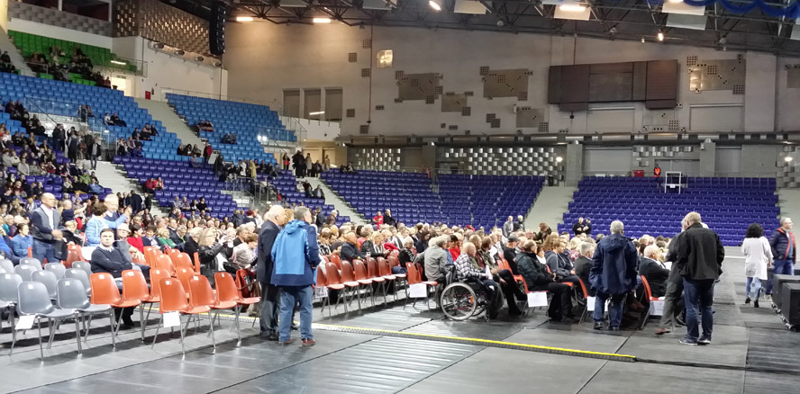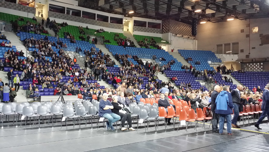 Audience gather in what looks like a fairly hard acoustic