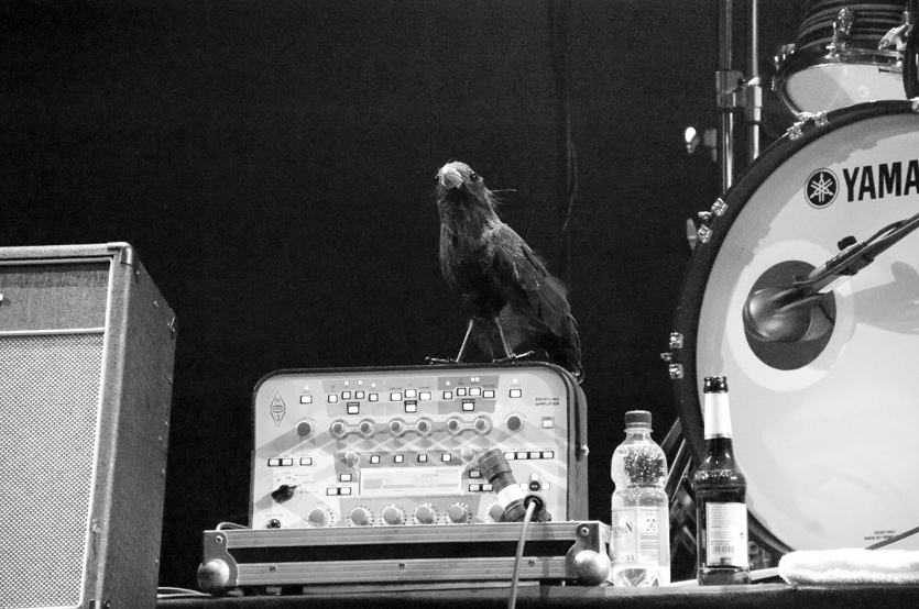 A feathered stagehand supervising Geoff's 'teasmaid'