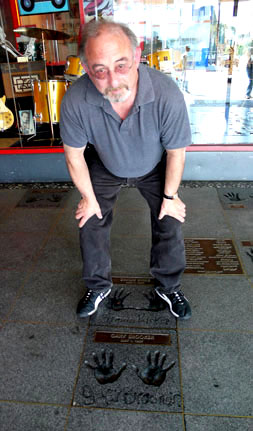 Six months later, my husband and I were on a round trip in California and while staying in Los Angeles, Allen picked us up at our hotel in a Mini Cooper. He drove us to the Rock Walk at Guitar Center Hollywood on Sunset Boulevard where we viewed the handprints of many famous rock musicians. Gary’s were there and we also found those of Dave Pegg, Eric Clapton and Cream. Jakob and I went to see Eric Clapton at the Staples Center that night – and with regard to Cream, Allen had been attending one of the reunion concerts at London’s Royal Albert Hall in May 2005 and we happened to be at that show, too. He had such a wide interest in music and also told us about his deposition agency and about producing a movie. However, I have no idea whether the movie ever came to fruition, or whether it was a misunderstanding from my part. Later in the day, he took us to the Farmers’ Market to meet with fellow-fan Jeremy Gilien, and insisted on paying for our meals. Allen enjoyed socialising and was a charming and most generous host. We did see him again a few times since but in recent years he travelled less and our paths crossed for the last time at London’s Royal Festival Hall in March 2017.