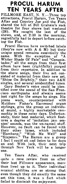 Three top attractions, Procul [sic] Harum, Ten Years After and Country Joe and the Fish, shared the bill at Bill Graham's rock theatre for four shows last weekend [27 + 28 September 1968 Ed]. We caught the last of the shows, and, at 2:30 in the morning, regretfully had to depart before catching the Fish.