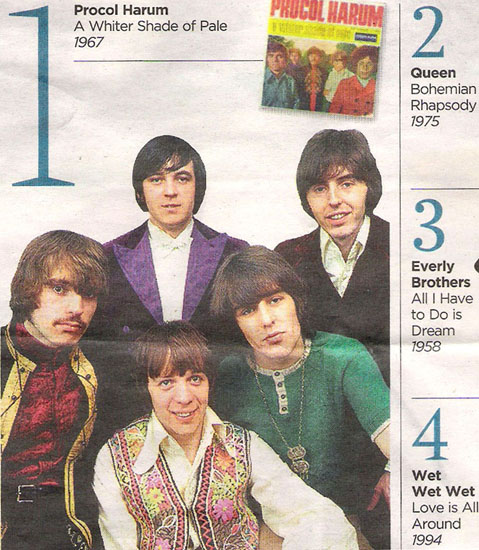 'Twas ever thus ... see here The haunting organ theme has been a favourite on pub jukeboxes for more than four decades and was the subject of a bitter court case last year, Now A Whiter Shade of Pale has been confirmed at the most-played song in British public places in the past 75 years ... ... Gary Brooker, the lead singer of Procol Harum, said yesterday that the news that it had topped the PPL chart was a 'great and unsought honour'. "It isn't something I could have remotely imagined when I wrote the