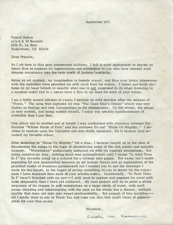 September1971 Procol Harum Dear Friends, As I sit here in this gray government building, I felt it most appropriate to devote my break time to express my appreciation and admiration to you who have created such strange excursions into the twin world of fantasy/morbidity. Being an art student, my imagination is largely visual, and thus your lyrics interwoven with the melodies have provided me with much food for vision. I listened and build pictures in my head (which is exactly what one is not supposed to do when listening to a musical work) and in a sense have a film in my head for each of your songs. I am a fairly recent admirer of yours; I became an avid devotee after the release of Home. The song that captured me was The Dead Man's Dream which was very Gothic in feeling and very Lovecraftian in its strangeness. On the whole, the album is very morbid, and being morbid myself, I enjoy any artistic manifestations of morbidity that I can find. One album led to another and at length I was confronted with choosing between the familiar Whiter Shade of Pale [this was indeed an album title in America] and the unknown (to me) Shine on Brightly. I decided to venture upon the Unknown and was richly rewarded, for it became (and remains) my favorite album. After listening to Shine on Brightly for a time, I became caught up in the idea of illustrating the songs in the hope of crystalizing [sic] some of the rich poetic and melodic imagery. Moonbeams particularly intrigued me with its magical atmosphere. But being notoriously lazy, nothing much was accomplished until I chose In Held 'Twas in I (my favorite song) as a subject for a college term paper. The essay isn't worth repeating (it was sandwiched between an art history thesis and an explanation of the pluralist model of American government) but I wanted you to see the drawings I made for the report, in the hopes of giving something to you in return for the enjoyment I have received from each of your artistic works. Incidentally, In Held 'Twas in I hasn't finished with me yet --- I still want to capture and express its mood with more originality than I have yet achieved. My next project will be to paint a whole sequence of its images in soft watercolors on a large circle of wood, with each image blending and intermingling with the next so the whole has a dreamy, twilight quality that does not sink into sweet sentimentality. But enough of this rambling --- all I really want to say is Thank You and hope you like this small token of appreciation for your fine music Sincerely, Carole M Hassan |