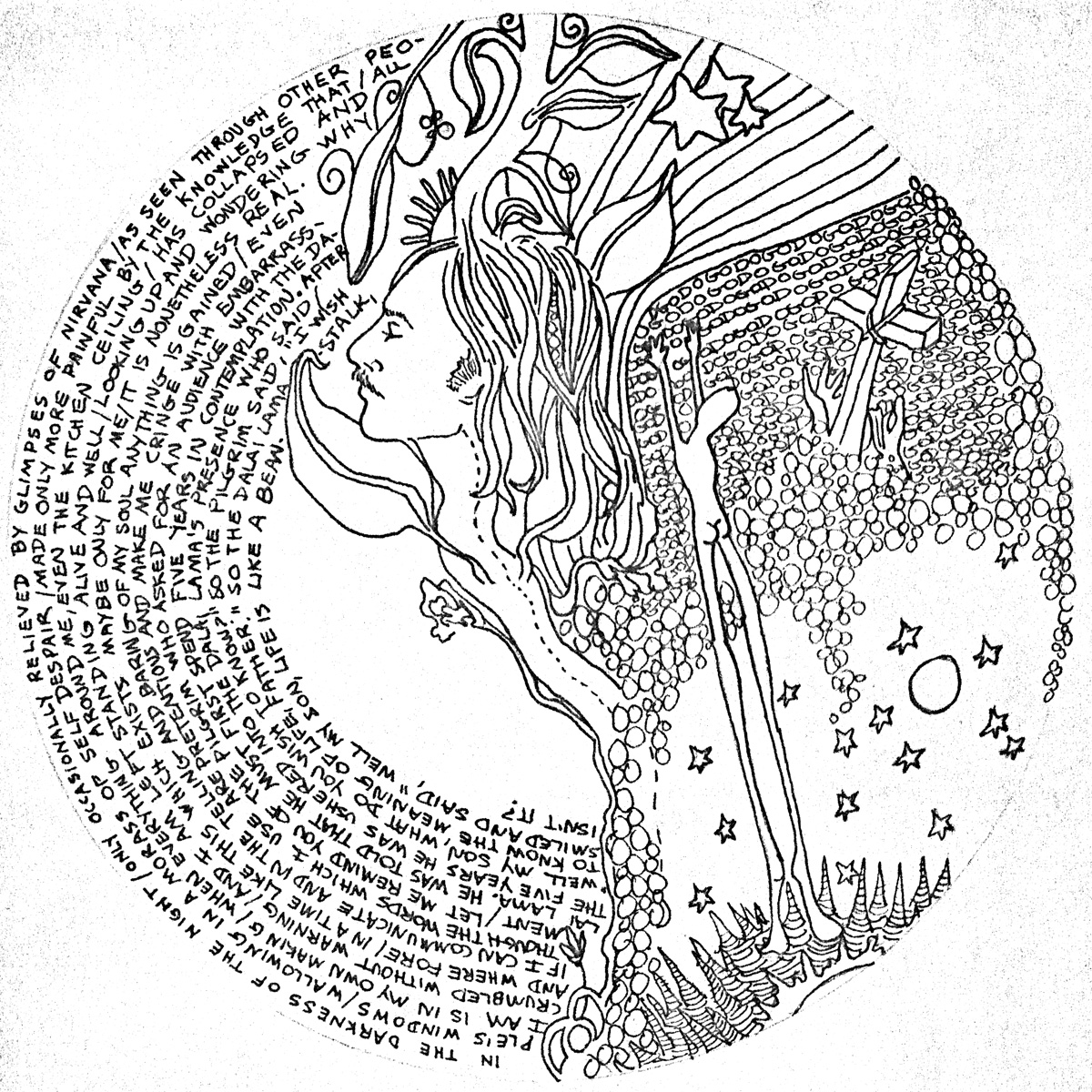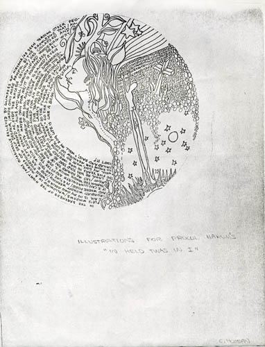Above, the first of five tondi from the pen of Carole M Hassan. As we have only a photocopy, we cannot be sure of the medium in which it was executed: at a guess, a thin felt-tipped pen. The central image is of a young man, fashionably long-haired, and clean-shaven but for a lip-weasel, whose body takes the form of a beanstalk, bisected by a dashed meridian reminiscent of the line down the middle of a road. The knotty roots at the foot of the Beanstalk are drawn in a way that calls to mind the vegetation depicted in the bottom right-hand corner of the 1967 Procol Harum album cover ('The Black Album').