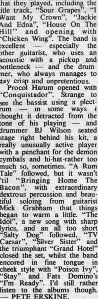 Procol Harum can then confound the ear by coming to grips with the grand style they seek, starting with Bringing Home The Bacon, through BJ Wilson’s drum solo and The Idol (a new song with the tell-tale line from lyricist Keith Reid 'Just another writer turned to play' [sic]) until the group is thunderously classic in Shine On Brightly, TV Caesar and Silver [sic] Sister. Grand Hotel fittingly closed their set proper. Brooker prefaced it with a snatch of Poison Ivy – the Paramounts are not forgotten – and their rock encores – Maurice Williams’ Stay and Fats Domino’s I’m Ready – show that here’s a band that could, if it chose to, roll the rocks off allcomers [sic].