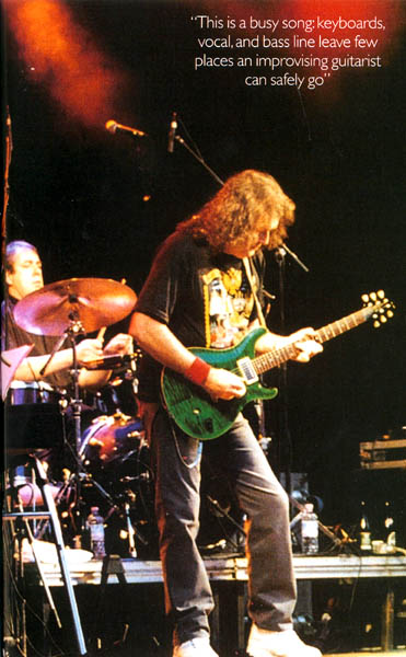 For the arpeggio backing part find a clean, chorused sound with plenty of treble: you'll probably want both pickups for this. For the overdriven lead parts, switch to bridge pickup only, and turn up the gain: a bit of presence helps a great deal, but take care not to overdo the distortion, or you won't hear the natural tone of your instrument and your playing will lack light and shade.