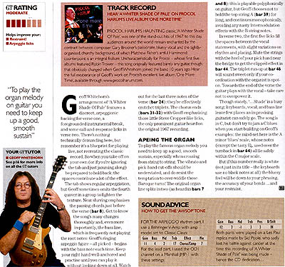 Geoff Whitehorn's Whiter Shade features a discreet, arpeggionic backing for verse one, a foregrounded instrumental break, and some call-and-response licks in verse two. There's nothing technically demanding here, but remember it's a blueprint for playing live, not recreating the classic record. So when you take off on your own (or if you're ignoring the tab and just jamming along) be prepared to hold back, and study what Geoff's not doing: the spaces contribute a lot of the effect.
