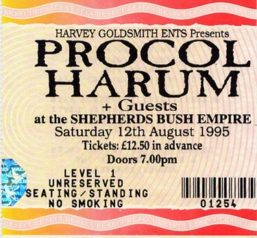 It was 1995 and MacGregor had moved from Leicester to London to work for the Civil Service in the Somerset House building I think. He left to go for some lunch one jolly day late in the month of May. While strolling along a very busy main road in central London something slightly strange just briefly caught his eye. There was a sandwich board man on the opposite side of the road. Guess what flashed from his board directly into MacGregor's watcher of all eye? It wasn't teatime at the circus, it was the heralding of a future event at the Shepherd's Bush Empire. Procol Harum live in concert!?!? By the time a few blinks and rubs of the MacGregor eye had expired, and the hands of the town clock in the square had resumed their previously perpetual motion, the Sandwich had moved on. Mac had to leg it. Through hot wires of human obstacles he skipped and broke through barricades of recently-frozen traffic, determined to get level once more. There it was again! A second glimpse of impending Nirvana! Yes it was nineteen NINETY five! His eyes had not been playing tricks.