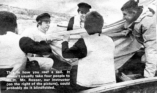 | This is how you reef a sail. It doesn't usually take four people to do it. Mr Rosser, our instructor, (on the right of the picture) could probably do it blindfolded. | |||