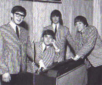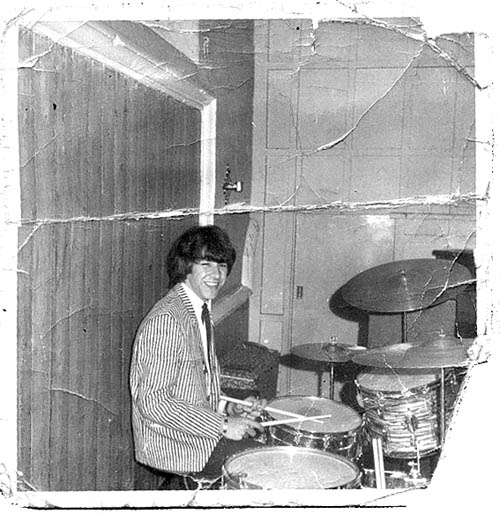 A photograph, frayed, folded and fascinating: Barrie sits at his kit in a bare ballroom, smiling in his stripy jacket (also modelled by Phil Wainman!): note the four-piece kit with three cymbals, and the piano off to the right. Wouldn't it be nice if we could get this photo restored!