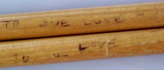 A faint legend, 'To Sue love BJ' , is still visible on this pair of sticks. The lucky dedicatee was a friend of Pam Quinn's, still in touch with the family. She was badly ill with rheumatic fever as a child. |