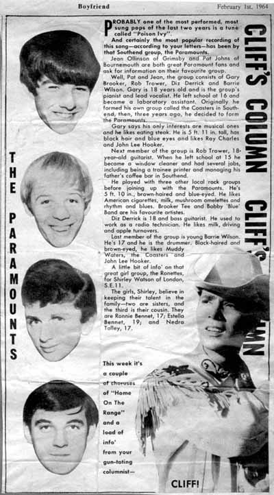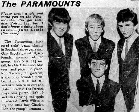 The Paramounts (pictured right) began playing in Southend three years ago. Gary Brooker, aged 18, is a founder member of the group. He's 5 ft 11.5 ins tall, has black hair and blue eyes, and plays the piano. Rob Trower, the guitarist, is the other founder member. He's 5 ft 10 ins tall and likes American cars and British Beatles! Diz Derrick plays bass guitar. He's 19 and likes driving and apple turnovers. Barrie Wilson is 17, and likes Ray Charles. He's the group's drummer.