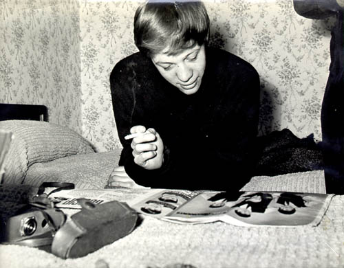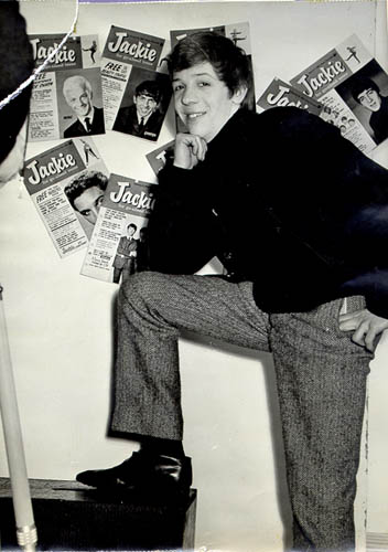 covers, pinned up in a rather improbably random fashion. Robin's foot rests on the same plinth that Gary used: it could conceivably be a drawer, perhaps pulled out of the mirrored dressing-table; or maybe it's part of a photographer's kit, since the tripod-leg, the dangling cable-release, and the excellent resolution of the lens all suggest something more than amateur snapshotting. Mysteriously, however, this is evidently not taken with the camera on the tripod! The Jackie covers are marked 1964, thus dating the pictures in this sequence to after 7 March, the date of the Lennon-covered edition on the far right of the shot. (RC) |