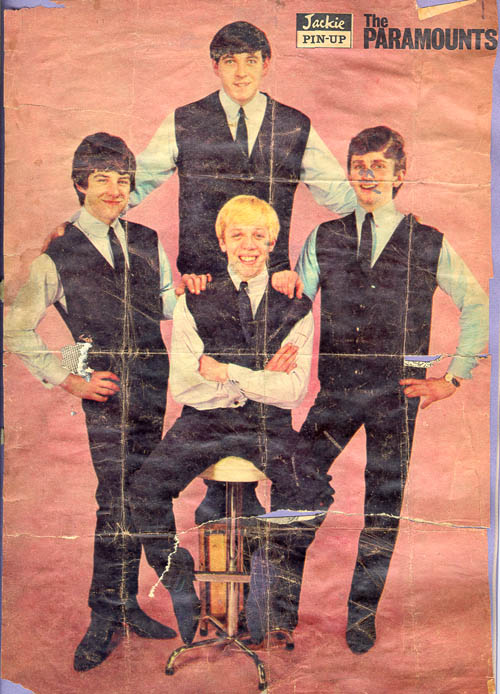 This is the index page for a large deposition of Paramounts photographs, cuttings, and other memorabilia sent to 'Beyond the Pale' by Barrie Wilson's sister, Pam, in March 2000. The illustration shows Barrie and Pam on a recreation-ground roundabout; thanks to their third sibling, Richard, for sending it in to BtP. When she was about eight or nine Pam started to collect cuttings from pop magazines, recording the glamorous doings of her percussionist brother, seven years older than herself. These cuttings were glued into a scrapbook which eventually found its way into her parents' attic, where it was rediscovered about three years ago when their house was being cleared. Pam transferred the contents of this decrepit volume into a new scrapbook, whose pages are presented here in public for the first time. Click on the pictures in the table below to see and read much more … |