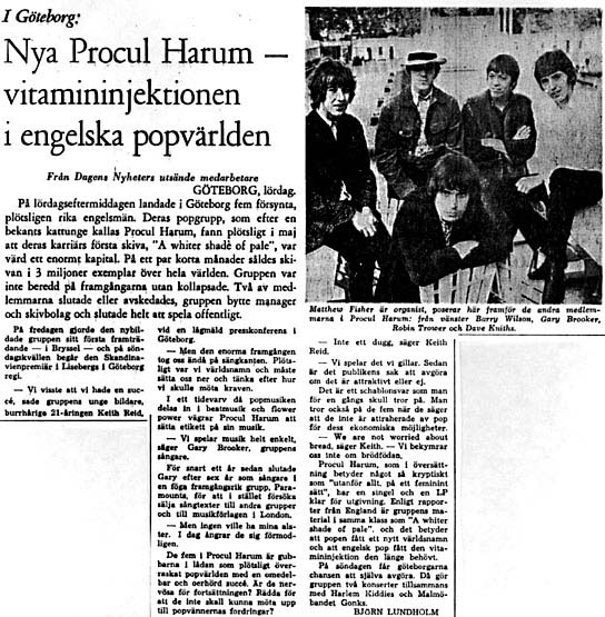 Saturday afternoon, five modest, suddenly rich Englishmen, landed in Gothenburg. Their pop group, called Procul [sic] Harum after the name of a friend's kitten, in May suddenly found that the first record of their career, A Whiter Shade of Pale, was worth an enormous capital. In a couple of short months the record sold more than 3 million copies worldwide. The group was not prepared for the success and collapsed. Two of the members quit or were fired; the group changed manager and record company and stopped playing in public.