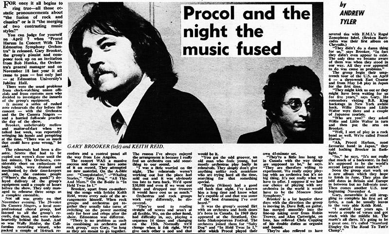 You can judge yourself on 7 April when Procol Harum in Concert with the Edmonton Symphony Orchestra is released. Gary Brooker, the group’s pianist and composer, took up an invitation from Bob Hunka, the orchestra's general manager, and on 18 November last year it all came to pass – but only just – at Edmonton University’s Jubilee Hall. There were the usual problems from clock-watching union officials and from Customs men who decided to investigate the innards of the group's equipment.
