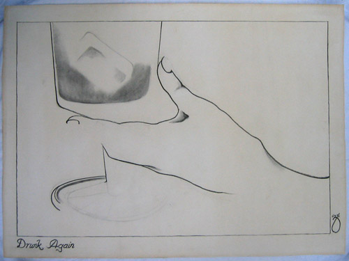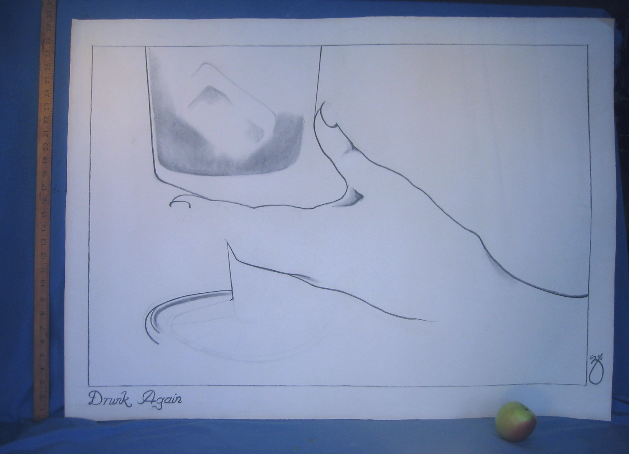 The dimensions of the picture, measured by Gary himself, are 749 x 1015 mm. The artwork has been executed in charcoal on Rives BFK Elephant double weight paper. It has been fixed to prevent smudging. Some pencil lines are still faintly visible, clear evidence of its status an an artist's original. This picture didn't appear in the Grand Hotel booklet, because the song was not used on the album: it surfaced as a Procol 'B' side eventually, of course. The piece is consequently a real rarity: bid for this uniquely decorative piece of Rock History, at eBay We took three photographs of the original: the first was taken in Gary Brooker's barn in August; the second, out of doors at the Brooker residence in October; the third indoors in Bristol in November, with the addition of items to show the scale of the pictures: a yardstick and an apple. One picture rather over-emphasises the slightly yellow tinge of the art paper; another has a blue tinge reflected from the cloth the pictures are propped against. Click on the main images to see them in detail, and satisfy yourself of all the condition of the picture.. |