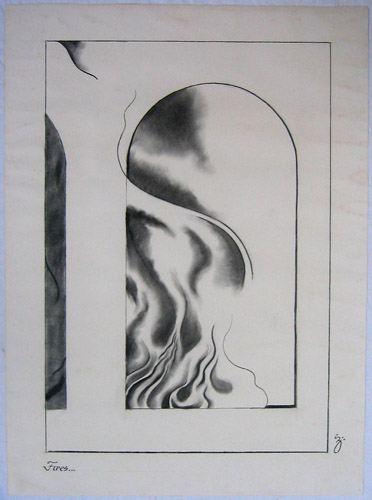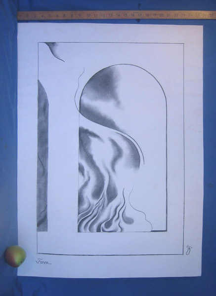 for this uniquely decorative piece This unique piece of original artwork by renowned designer Spencer Zahn has been offered for auction by Gary Brooker, the sale proceeds to go to the BJ Wilson Memorial Fund, and to continue the running of 'Beyond the Pale', the Procol Harum website. The dimensions of the picture, measured by Gary himself, are 650 x 889 mm. The artwork has been executed in charcoal on Rives BFK Elephant double weight paper. It has been fixed to prevent smudging. We took two photographs of the Grand Hotel original: the first was taken out of doors at the Brooker residence on 26 October 2004; the second was taken indoors in Bristol on 8 November, with the addition of items to show the scale of the pictures: a yardstick and an apple. The first set rather over-emphasises the slightly yellow tinge of the art paper; the second set has a blue tinge reflected from the cloth the pictures are propped against. Click on the images to see them in detail.