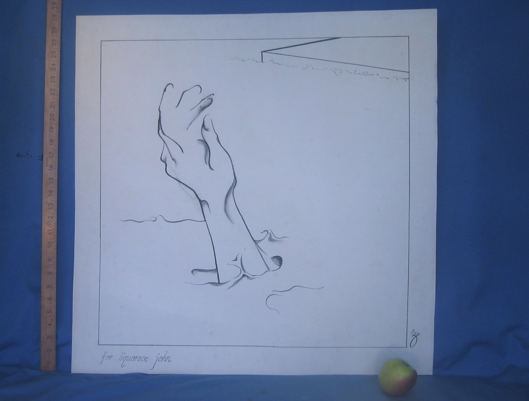 The dimensions of the picture, measured by Gary himself, are 718 x 718 mm. The artwork has been executed in charcoal on Rives BFK Elephant double weight paper. It has been fixed to prevent smudging. Gary Brooker holds the artwork in a frame, to show how it would look when mounted on the wall: please note that the frame is not part of the present sale. We took two photographs of this Grand Hotel original: the first was taken out-of-doors at the Brooker residence on 26 October 2004; the second was taken indoors in Bristol on 8 November, with the addition of items to show the scale of the picture: a yardstick and an apple. The first attempt rather over-emphasises the slightly yellow tinge of the art paper; the second has a blue tinge reflected from the cloth the picture was propped against. Click on the main images to see them in detail. Bid for this uniquely decorative piece of Rock History, at eBay |