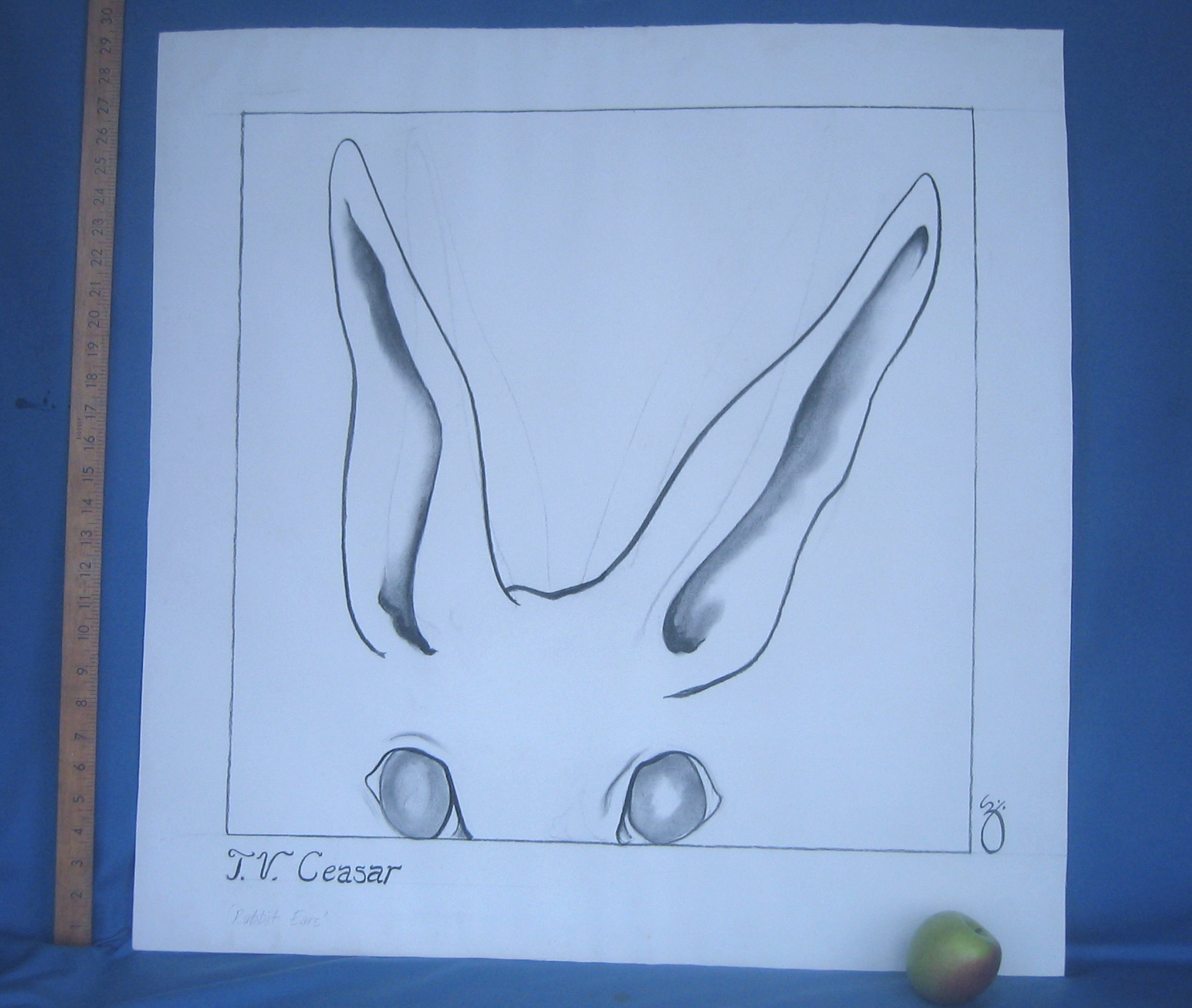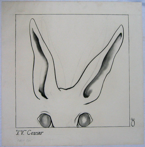 The first set rather over-emphasises the slightly yellow tinge of the art paper; the second set has a blue cast reflected from the cloth the pictures are propped against. Click on the images to see them in detail: in particular, note the trace of another outline between the ears, and the faint writing, 'Rabbit Ears', below the song-title (incidentally, the 'Ceasar' spelling pervades the album-sleeve, and is not peculiar to this illustration).