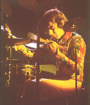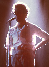 | The original of this picture is blurred, but the haloing makes this a particularly affecting portrait of Keith Reid, who is rarely depicted in action. But what is happening here? One guesses Glimpses of Nirvana ... but was that played at the Hollywood Bowl? It doesn't survive on any of the known recordings. |