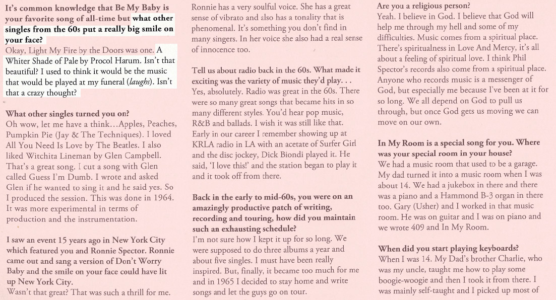 ![]() | Jim Corbett sends BtP part of a Brian Wilson interview from October 2008’s Record Collector. 'Thought it might be of interest,' writes Jim, 'Usually people seem to want it played at their wedding.' |