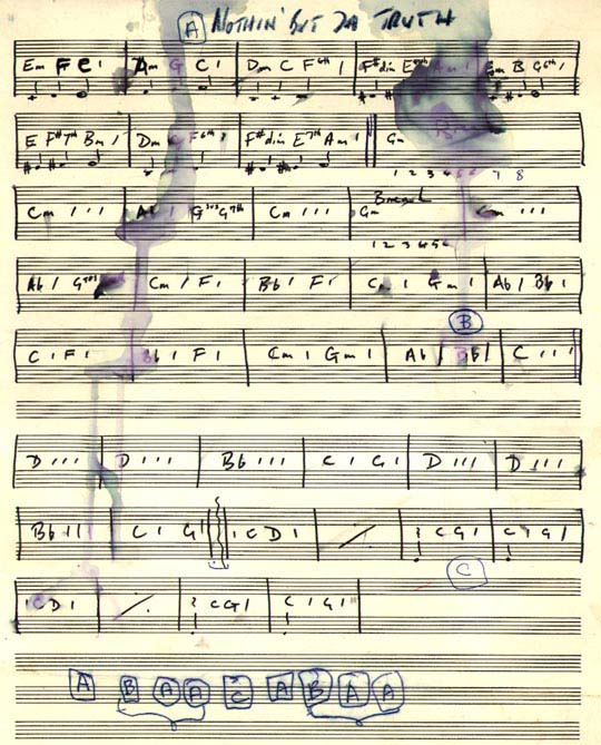 BtP pointed out that this was not really a lead-sheet, since it lacks the melody, and Chris Michie agreed, adding that 'I've always heard the term used when a musician was referring to something less comprehensive than a score. I suppose the correct term depends on whether it's a chart, score, lead sheet or back of a cigarette packet that's being referred to.'