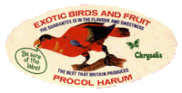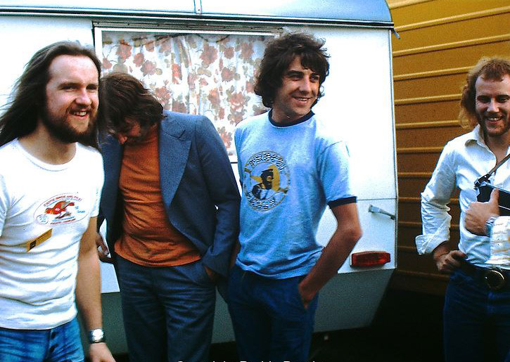 | Mick Grabham in the Exotic Birds and Fruit tee-shirt, Chris Copping nattily bethreaded, BJ Wilson in custom tee-shirt by Unsteady Freddie Salzberg (the same rhinestoned garment in which BJ was laid to rest) and Alan Cartwright; high spirits, in the glamorous environs of a trailer caravan. Perhaps the lone hand, clutching the SLR camera, is attached to Gary Brooker? | ![]() |