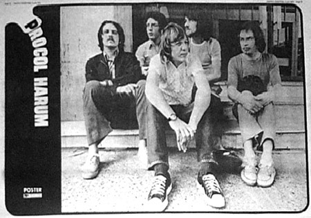A slightly tired-looking Procol in a French news poster from the end of the Trower period ... the bearded BJ period, in fact. L-R: Brooker, Reid, Trower, Wilson and Copping. |