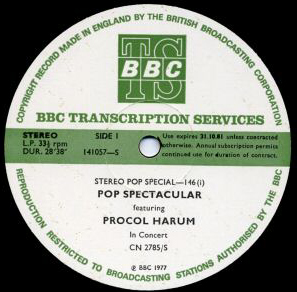 This is the label from the 12” stereo BBC TRANSCRIPTION SERVICES LP containing STEREO POP SPECIAL – 146 (i) and (ii) (CN 2785/S). This Pop Spectacular LP, from mid-1977, features Procol Harum.playing Something Magic; Conquistador; Strangers in Space; Grand Hotel; Pandora’s Box; Nothing but the Truth; Skating on Thin Ice; The Mark of the Claw; A Salty Dog; Wizard Man and This Old Dog.