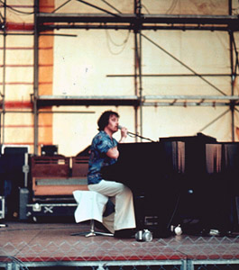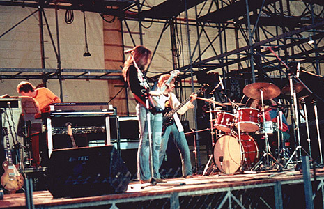 Whaler Hans Volkhardt writes to BtP with two nice stage photographs: "On 6 June 1976 Procol Harum gave a concert in Offenburg, Germany, at an open-air festival. Besides Procol there were other bands such as War, Bob Marley, Alvin Lee, Man, Wishbone Ash and others. I took these two photos: I was there with two friends. When PH was playing, we went directly in front of the stage. It was my first concert with Procol!" Left: Gary Brooker at a nice shiny grand, with towel on his piano-stool, announces a number. Note the stretch of garden fence in front of the stage! |
