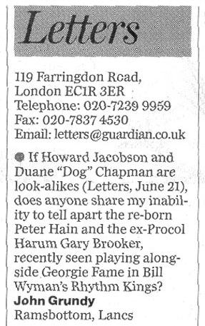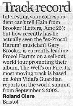 Sir, Interesting that your correspondent can't tell Hain from Brooker (Letters, June 23); but how "recently" has he actually seen the 'ex-Procol Harum' musician? Gary Brooker (MBE) hasn't played with the Rhythm Kings side-project for a couple of years, but is currently leading Procol Harum on a sell-out world tour promoting their 2003 album, 'The Well's on Fire' - its most moving track based on John Vidal's Guardian feature about the World Summit from 2 September 2002. (I notice that you have yet to review this CD!) Peter Hain-fanciers should check the supposed resemblance for themselves! Procol tour dates are at www.procolharum.com |