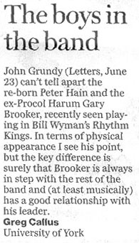 The Boys in the Band John Grundy (Letters, June 23) can't tell apart the re-born Peter Hain and the ex-Procol Harum Gary Brooker, recently seen playing in Bill Wyman's Rhythm Kings. In terms of physical appearance I see his point, but the key difference is surely that Brooker is always in step with the rest of the band and (at least musically) has a good relationship with his leader. Greg Callus Published 24 June 2003 |