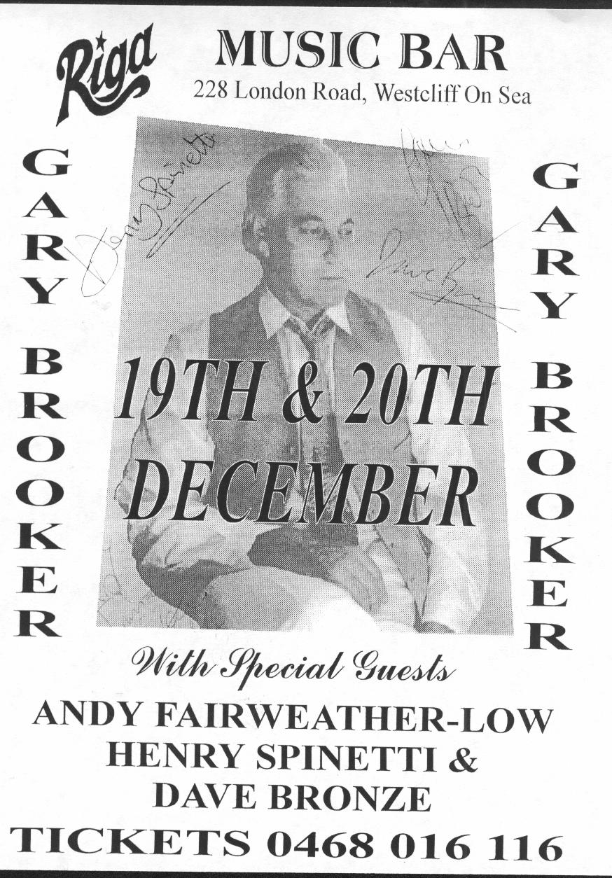 After the concert, it was obvious that Gary and co were among friends. The Paramounts used to play the clubs in Southend. Gary's father was a musician at a local hotel, and Gary himself had done his first stage performance a few blocks from Club Riga. So Gary walked around, greeting old friends and apparently having a good time. One didn't want to intrude, it was obvious he was talking about old times with long-lost friends. But The Commander was nice as always, talking to all the Palers, And shaking hands and wishing a Merry Christmas to those of us that not planning to return for Sunday's concert. Dave and Louise were so delighted by tonight's performance that they decided to stay another night and promptly bought tickets for tomorrow's concert.