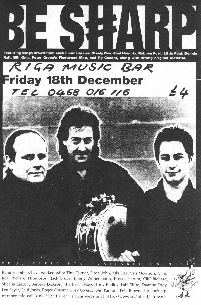 Club Riga was a small, local music pub: a floor said to hold about 150 persons, a few chairs and a bar. And a small stage, that could barely hold the five Shoes and their instruments. But apparently the club had a good management: the posters on the walls told the tale of a club that had hosted many fine musicians. Only the day before we came, Be Sharp had played Club Riga. Be Sharp is a band that should be known to the Palers, as one of its members has a definite Procol Harum connection. |