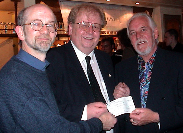 Roland and Jens present Gary Brooker with a BtP cheque, made payable to The BJ Wilson Memorial Fund, following the auction sale of the tail-coat described below. |