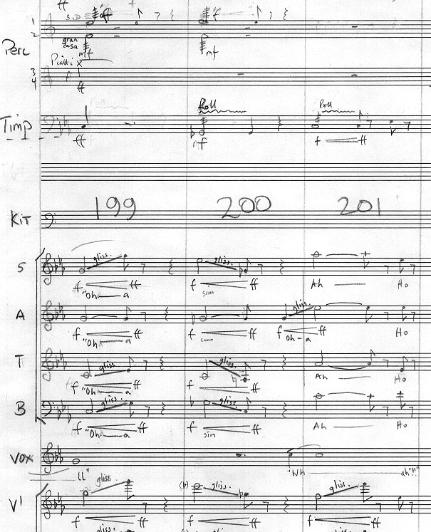 The illustration below shows a detail of the percussion writing (in addition to the drum kit (not playing here) and the timpani (marked 'Roll'), it's scored for four players: gran casa is 'bass drum' and piatti are 'cymbals') and the intricacy of some demanding vocal parts, Soprano, Alto, Tenor and Bass.