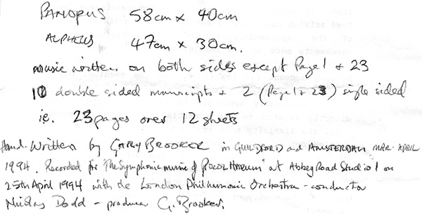Gary's hand-written statement of provenance, included for sale with the score, specifies that he used Panopus scoring-paper for the first page (bars 1 - 12), Alpheus paper for pages 2 to 7 (bars 13 - 76), and Panopus again for the rest (pages 8 - 23, bars 77 - 202).