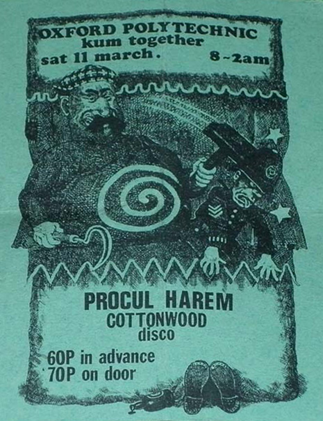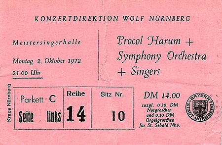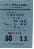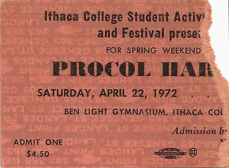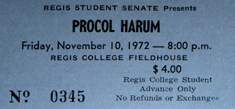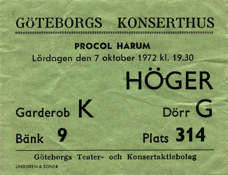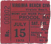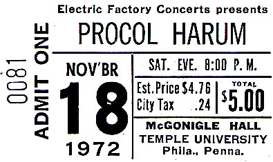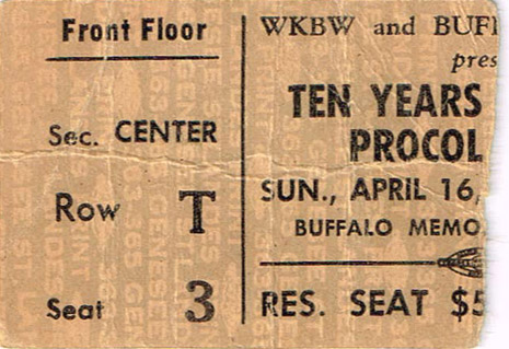 'Best concert I ever saw: Virginia Beach Civic Center, USA. Great venue, maybe 2,500 maximum. Seats was $4.50– opening, The Eagles on their first US tour. Procol opened with Shine on Brightly, closed with In Held. Encore was Repent, and they also played Whiter Shade, Piggy Pig Pig, Whaling Stories, Quite Rightly So, and A Salty Dog. (thanks, Litt) |