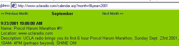 But that 1971 Procol marathon, a mere hour long, seems positively stunted by comparison with the six-and-a-half hours of Procol music – 79 songs! – that was transmitted from the Ackerman Union Grand Ballroom by uclaradio.com on Sunday 23 September 2001 by guest DJ 'Number Six'. The occasional stuttering net-congestion was compellingly reminiscent of pirate days … and the music just sounded perfect once again, superb and fresh through the tiny, PC speakers.