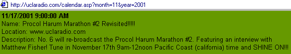 uclaradio.com broadcast their second internet Procol Harum marathon on 21 October, but it encountered certain technical difficulties (see here), However the show was broadcast afresh (not from a tape) on 17 November, and came through loud and clear: here is the playlist from the show:
