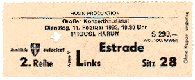 Seeing this page, Harald Pepl kindly sent a scan of his own ticket for the show, adding "Hi, here's another Concert ticket from the Procol Harum Show in Vienna, Konzerthaus 11 February '92. I hope he's good for your collection. I remember, a brilliant show in a wonderful concert house. Only seatings ! (3000) and nobody stand up the first 75 minutes. With my 24 years on this time, I was under the youngest person to see this concert. Many people coming in suit and evening dress. Greetings from Vienna!'