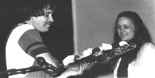 / 15 / 1977; receiving cake onstage to commemorate 10th
