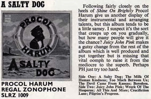Ever since A Whiter Shade of Pale (probably one of the best singles ever made) Procol Harum have been steadily gaining devotees all around the world. With A Salty Dog they return on probably the most satisfying album they've made yet. It's above all heavy – the word could have been invented with Procol in mind – and still with those rolling, soaring Gary Brooker / Keith Reid songs, with those strange lyrics which taken cold are meaningless but taken in the context of the songs still convey a whole world of atmosphere and feeling. The title track is perfection, and the others don't fall far short.