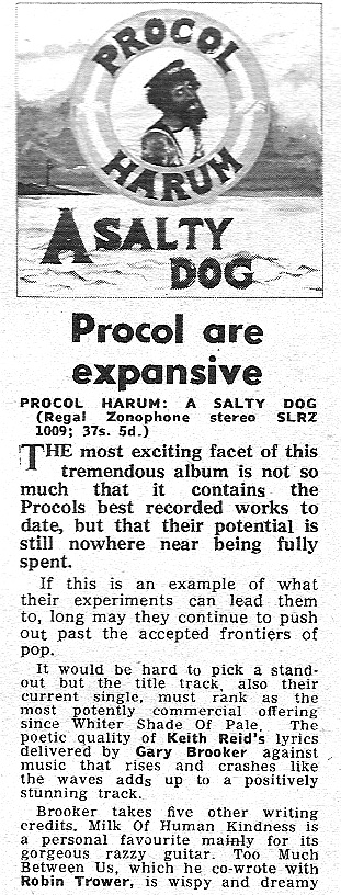 The most exciting facet of this tremendous album is not so much that it contains the Procols' best recorded works to date, but that their potential is still nowhere near being fully spent. If this is an example of what their experiments can lead them to, long may they continue to push out past the accepted frontiers of pop. It would be hard to pick a stand-out but the title-track, also their current single, must rank as their most potently commercial offering since Whiter Shade of Pale. The poetic quality of Keith Reid's lyrics delivered by Gary Brooker against music that rises and crashes like the waves adds up to a positively stunning track. Brooker takes five other writing credits; Milk of Human Kindness is a personal favourite, mainly for its gorgeous razzy guitar. Too much Between Us, which he co-wrote with Robin Trower, is wispy and dreamy ... (this is where our scan ends) ... with shades of Incredible String Band in the harmonies. The Devil Came from Kansas has a distinct country feel with Barrie Wilson's powerful drumming behind a piano running rife. All This and More is nearer the old Procols. Boredom, by Brooker and Matthew Fisher, has the latter featured strongly on marimba with a pretty calypso lilt making it one of the most appealing songs. Fisher on his own has two entries, stand out being Wreck of the Hesperus with a complex arrangement for piano and strings that spins like whirlpools of water and has a charm and prettiness little found in today's pop. The album also marks the emergence of Trower as a writing force. His two songs include Juicy John Pink, a strident rock blues with shades of John Lee Hooker. Other titles: Crucifiction Lane, Pilgrim's Progress