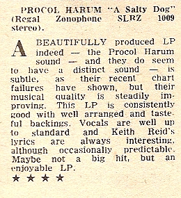A beautifully produced LP indeed – the Procol Harum sound – and they do seem to have a distinct sound – is subtle, as their recent chart failures have shown, but their musical quality is steadily improving. This LP is consistently good with well arranged and tasteful backings. Vocals are well up to standard and Keith Reid's lyrics are always interesting, though occasionally predictable. Maybe not a big hit, but an enjoyable LP. (four stars)