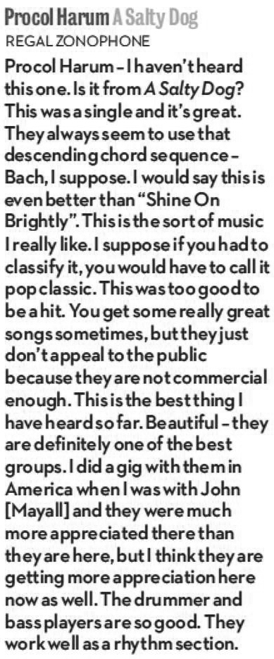 | Procol Harum A Salty Dog Procol Harum – I haven't heard this one. Is it from A Salty Dog? This was a single and it's great. They always seem to use that descending chord sequence – Bach, I suppose. I would say this is even better than Shine on Brightly. This is the sort of music I really like. I suppose if you had to classify it, you would have to call it pop classic. This was too good to be a hit. You get some really great songs sometimes, but they just don't appeal to the public because they are not commercial enough. This is the best thing I have heard so far. Beautiful – they are definitely one of the best groups. I did a gig with them in America when I was with John [Mayall] and they were much more appreciated there than they are here, but I think they are getting more appreciation here now as well. The drummer and bass players [sic] are so good. They work well as a rhythm section.