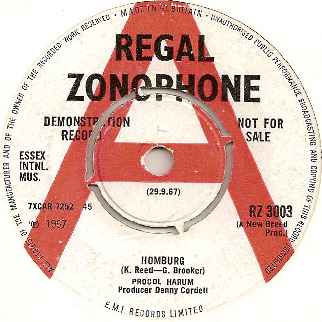 Tormod Ringvold writes to BtP (January 2012): 'The misprint "Reed" is to be found on stock copies of A Whiter Shade of Pale. I found a copy on eBay without much competition. All you need is to know – but this stuff is not mentioned in Record Collector. A little later, I found an A-label demo of Homburg, which also has the "Reed" misprint. In my opinion, this is a beautiful rarity.'
