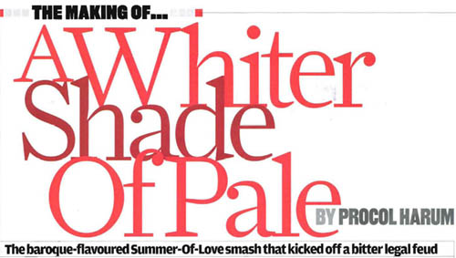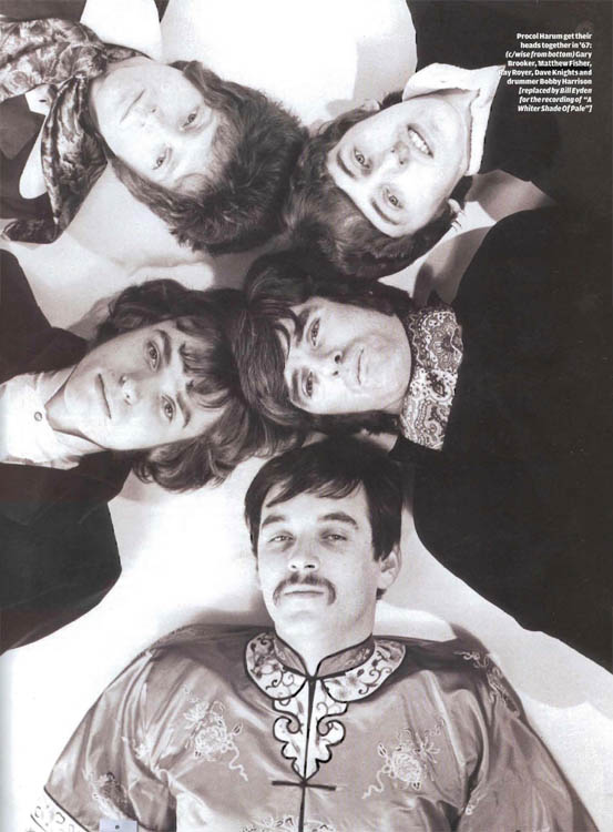 kicked off a bitter legal feud Even by the creative standards of 1967, Procol Harum's A Whiter Shade of Pale sounded extraordinary. John Lennon played it obsessively on acid while he waited for Sgt Pepper's release. Hearing it for the first time the night he met Linda Eastman, Paul McCartney described it as ‘a benchmark'. Meanwhile, across the Atlantic, a rattled Brian Wilson claimed it sounded like ‘my own funeral’. DJ / producer Guy Stevens had brought together Procol Harum’s songwriting partners Gary Brooker, from Southend R’n’B band The Paramounts, and poet Keith Reid in April 1967 [sic!]. Astonishingly, they released A Whiter Shade of Pale just one month later. With its haunting, Bach-inspired organ line from keyboard player Matthew Fisher and Reid’s enigmatic lyrics, A Whiter Shade of Pale became one of the most analysed and dissected songs of all time. It also became one of the most successful: in 2004, the performing Rights Group certified it the most-played song of the last 70 years, clocking up almost 1,000 cover versions and 10 million sales. A year later, Fisher filed a lawsuit against Brooker, claiming co-writing credits for the song. On December 20, 2006, Fisher was awarded 40% of the copyright [sic] in the high Court. Today Brooker and Reid are still outraged by the ruling, while Fisher harbours resentment towards his former bandmates. Quite what the '16 vestal virgins heading [sic] for the coast’ might have made of all this remains a matter of pure conjecture. (photo caption, right: 'Procol Harum get their heads together in '67: (clockwise from bottom) Gary Brooker, Matthew Fisher, Ray Royer, Dave Knights and drummer Bobby Harrison [ replaced by Bill Eyden for the recording of A Whiter Shade of Pale]')
