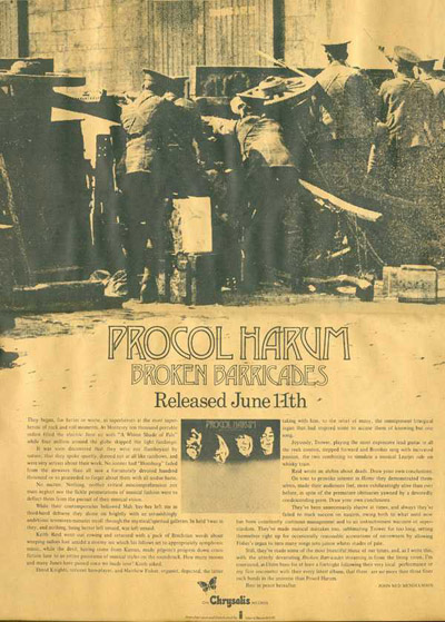 John Mendelssohn was not well-served by the clumsy typesetters – nor the art-director – of this Broken Barricades advertisement, which appeared as a full-page Melody Maker advertisement in 1971. The article is unmistakably anti-Hammond, which is strange for a Procol Harum fan, yet it resonates with his comments about Matthew Fisher thirty-three years later in his fictionalised Kate Bush biography.